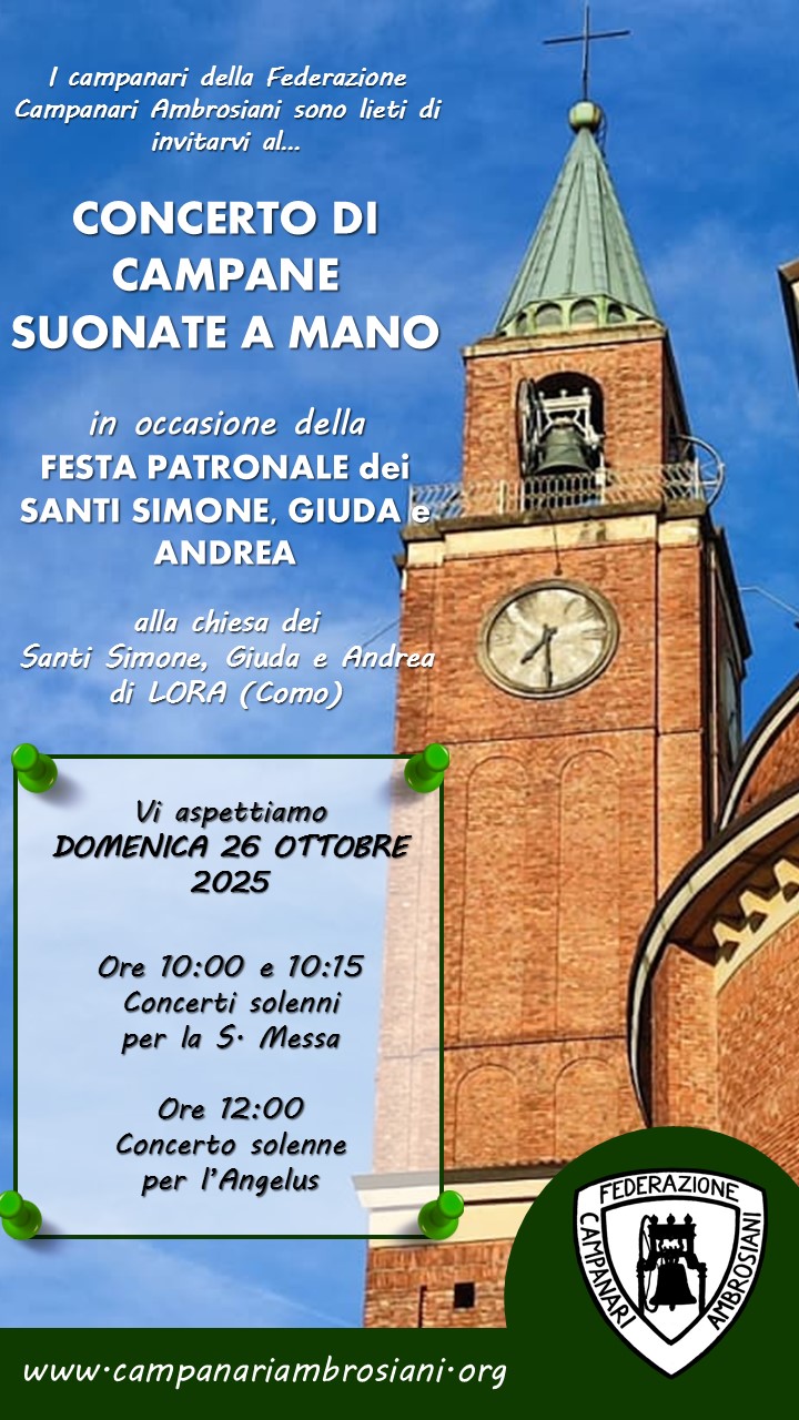 | Descrizione | In occasione della festa patronale dei Ss. Simone, Giuda e Andrea suoneremo le campane della chiesa parrocchiale di Lora, quartiere di Como, dove da qualche mese è stato ripristinato il sistema di suono manuale tramite le corde. |